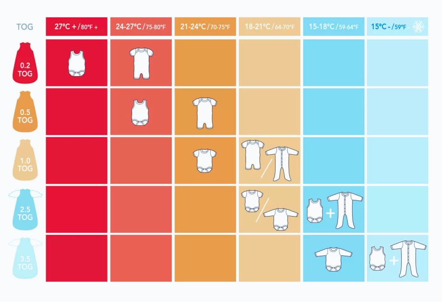 Il tog è un’unità di misura che indica quanto un sacco nanna è “caldo”. Non si sceglie in base alla stagione generica, ma alla temperatura della stanza in cui dorme il bambino.